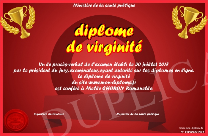 Envoyez par email votre diplome de virginité personalisé