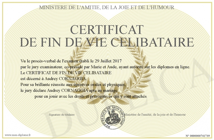 Envoyez par email votre CERTIFICAT DE FIN DE VIE CELIBATAIRE personalisé