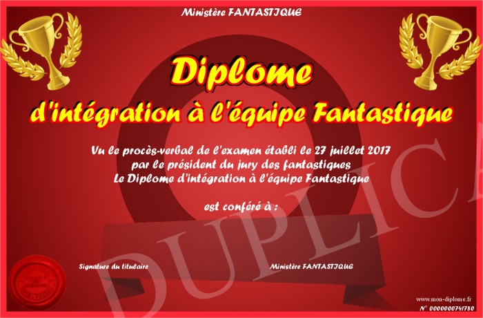 Envoyez par email votre Diplôme d'intégration à l'équipe Fantastique personalisé