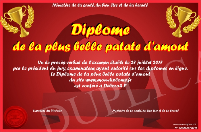 Envoyez par email votre Diplôme de la plus belle patate d'amout personalisé