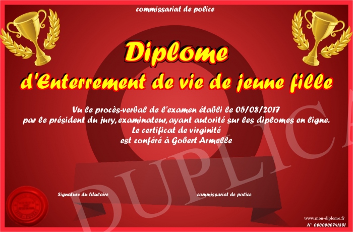 Envoyez par email votre Diplome d'Enterrement de vie de jeune fille personalisé