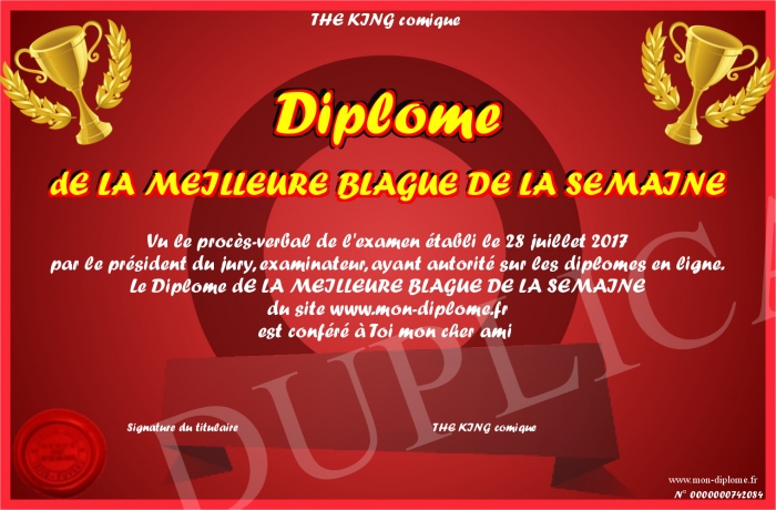 Envoyez par email votre Diplôme dE LA MEILLEURE BLAGUE DE LA SEMAINE personalisé