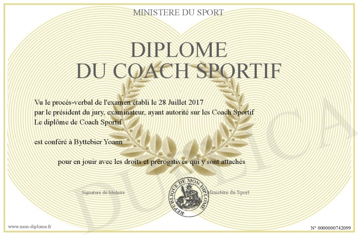 Envoyez par email votre Diplôme du Coach Sportif personalisé