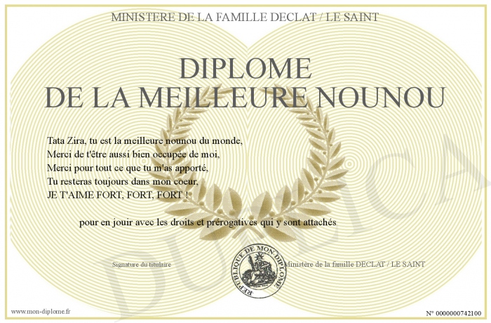 Envoyez par email votre Diplôme de la meilleure nounou personalisé