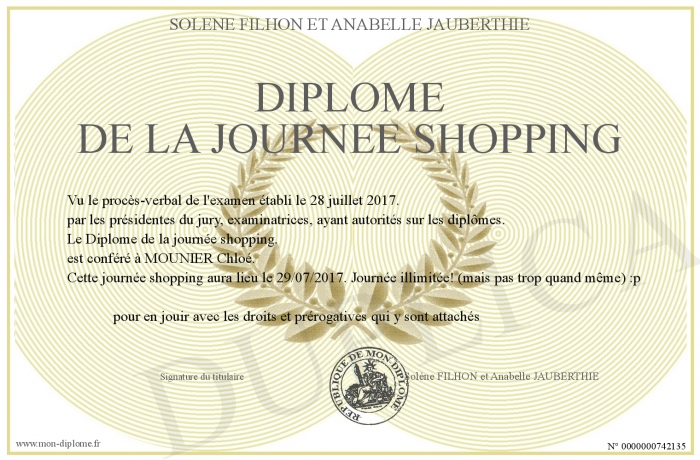 Envoyez par email votre Diplôme de la journée shopping personalisé