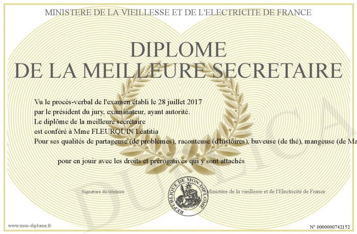 Envoyez par email votre Diplôme de la meilleure secrétaire personalisé