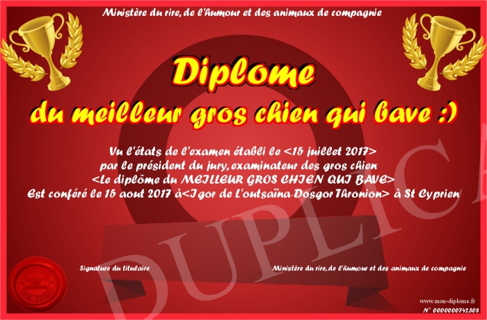 Envoyez par email votre Diplome du meilleur gros chien qui bave :) personalisé