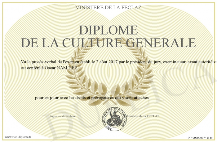 Envoyez par email votre Diplôme de la culture générale personalisé