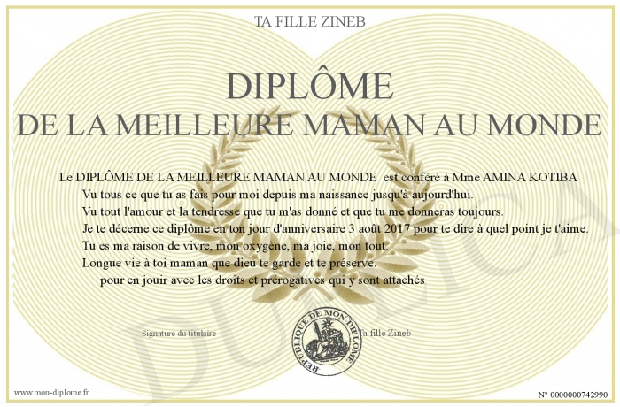 Envoyez par email votre DIPLÔME DE LA MEILLEURE MAMAN AU MONDE personalisé