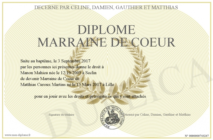 Envoyez par email votre Diplôme Marraine de Coeur personalisé