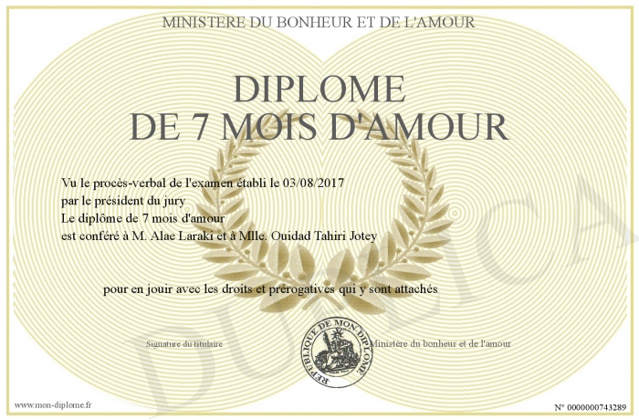 Envoyez par email votre Diplôme de 7 mois d'amour personalisé