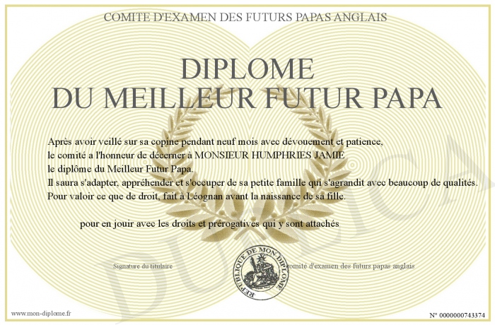 Envoyez par email votre Diplôme du meilleur futur papa personalisé
