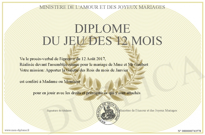 Envoyez par email votre Diplôme du jeu des 12 mois personalisé