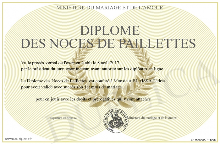 Envoyez par email votre Diplôme des Noces de Paillettes personalisé
