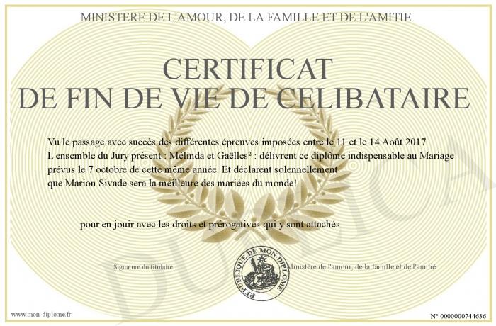 Envoyez par email votre Certificat de fin de vie de célibataire personalisé
