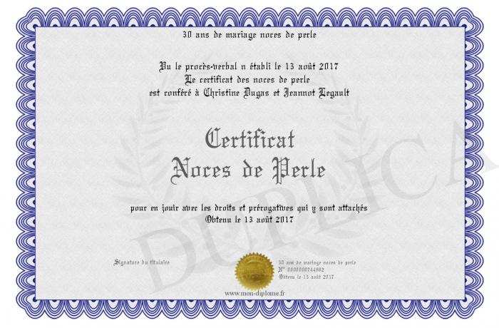 Envoyez par email votre Certificat Noces de Perle personalisé