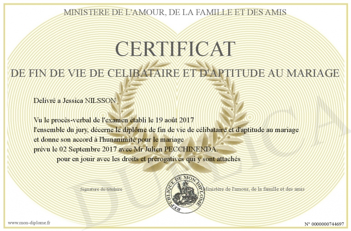 Envoyez par email votre Certificat de fin de vie de celibataire et d'aptitude au mariage personalisé