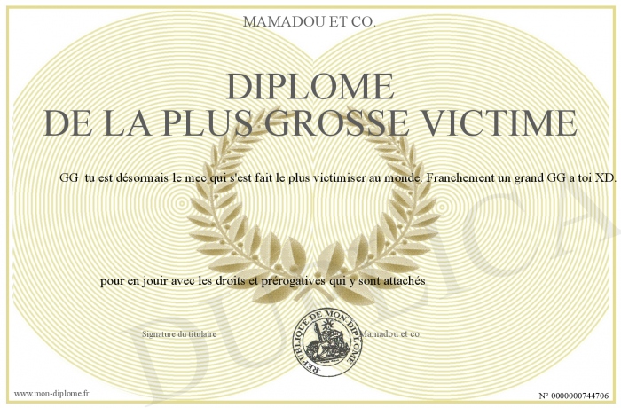 Envoyez par email votre Diplôme de la plus grosse victime personalisé
