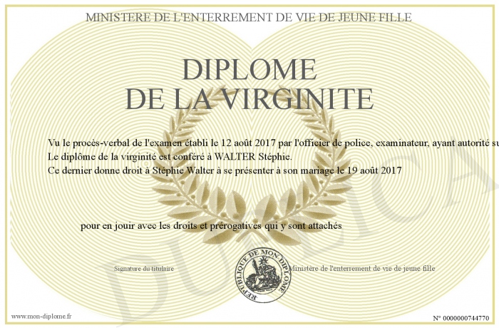 Envoyez par email votre Diplôme de la virginite personalisé