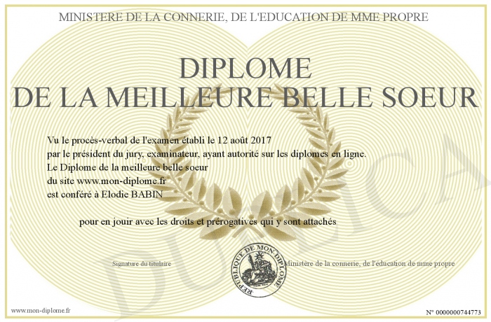 Envoyez par email votre Diplôme de la meilleure belle soeur personalisé