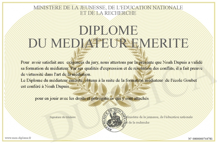 Envoyez par email votre Diplôme du médiateur émérite personalisé