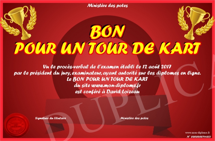 Envoyez par email votre BON POUR UN TOUR DE KART personalisé