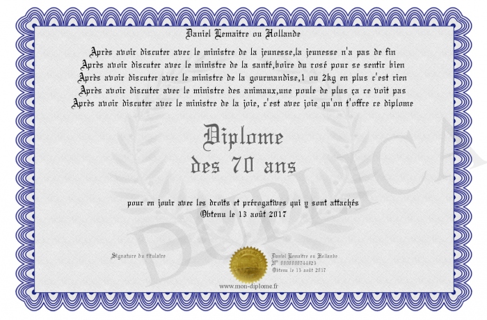 Envoyez par email votre Diplôme des 70 ans personalisé