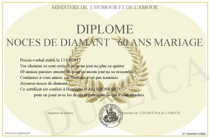 Envoyez par email votre DIPLOME NOCES DE DIAMANT 60 ANS MARIAGE personalisé