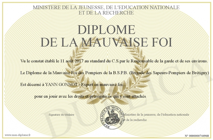 Envoyez par email votre Diplôme de la Mauvaise Foi personalisé
