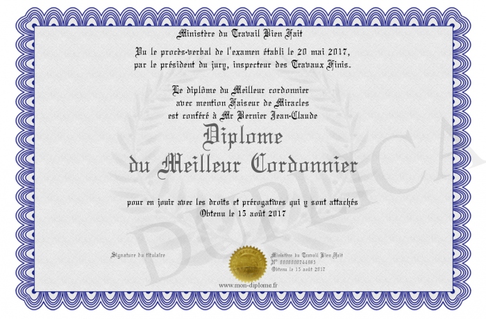 Envoyez par email votre Diplôme du Meilleur Cordonnier personalisé