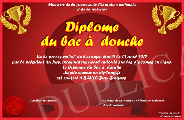 Envoyez par email votre Diplôme du bac à douche personalisé