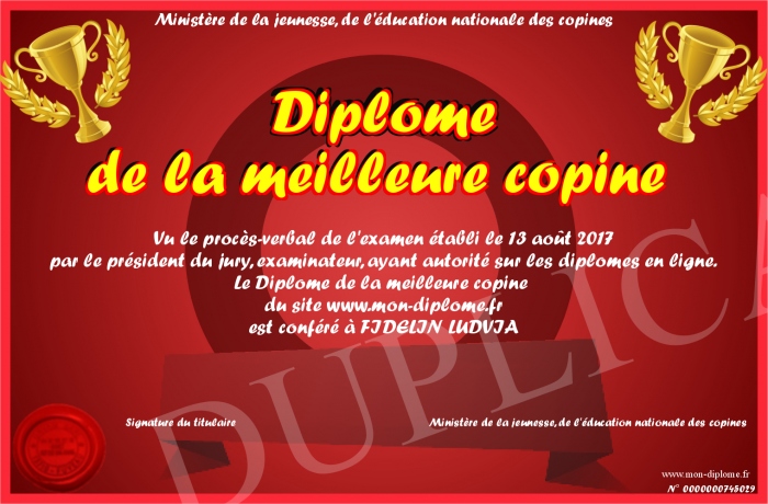 Envoyez par email votre Diplôme de la meilleure copine personalisé