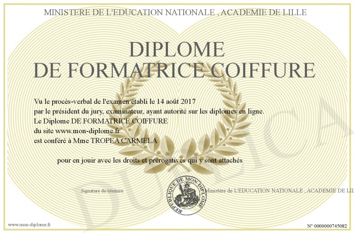 Envoyez par email votre Diplôme DE FORMATRICE COIFFURE personalisé