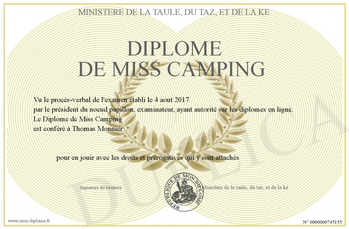 Envoyez par email votre Diplôme de Miss Camping personalisé
