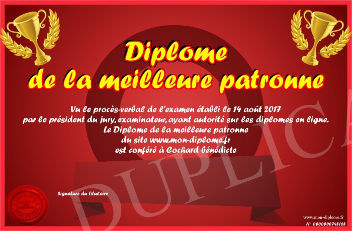 Envoyez par email votre Diplôme de la meilleure patronne personalisé