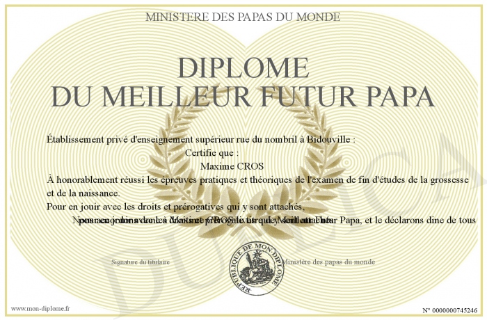 Envoyez par email votre Diplôme du meilleur futur papa personalisé