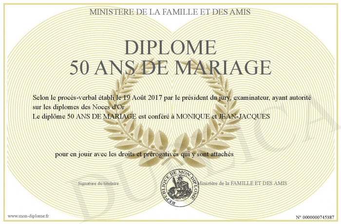 Envoyez par email votre Diplôme 50 ANS DE MARIAGE personalisé