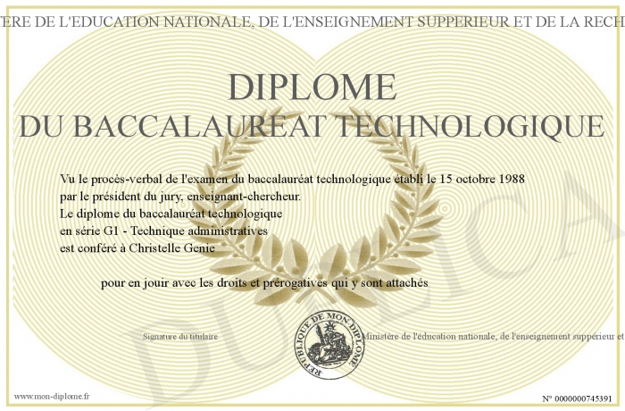 Envoyez par email votre Diplôme du baccalaureat technologique personalisé