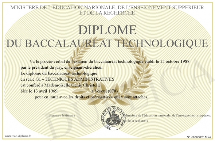 Envoyez par email votre Diplôme du baccalaureat Technologique personalisé
