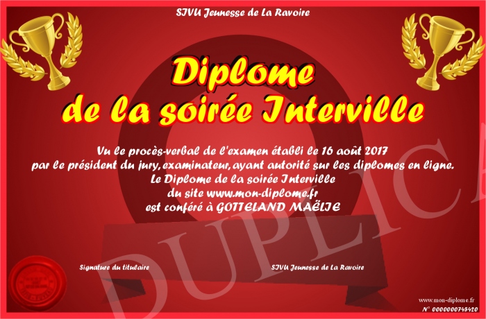 Envoyez par email votre Diplome de la soirée Interville personalisé
