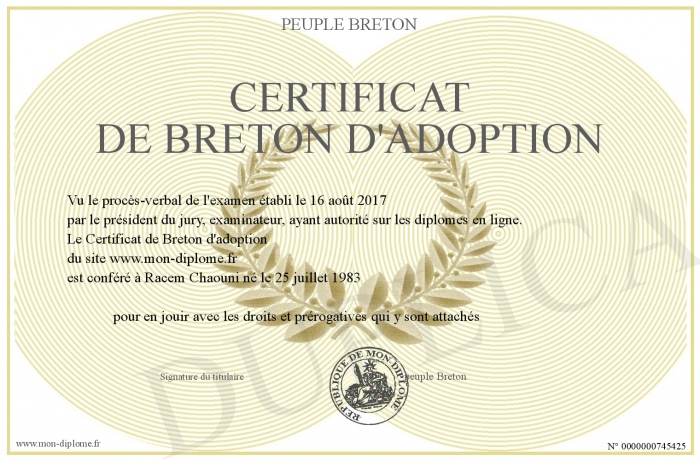 Envoyez par email votre Certificat de Breton d'adoption personalisé