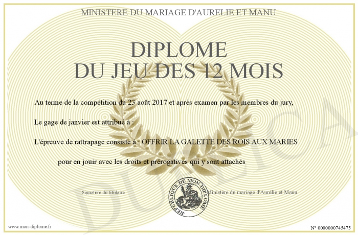 Envoyez par email votre Diplôme du jeu des 12 mois personalisé