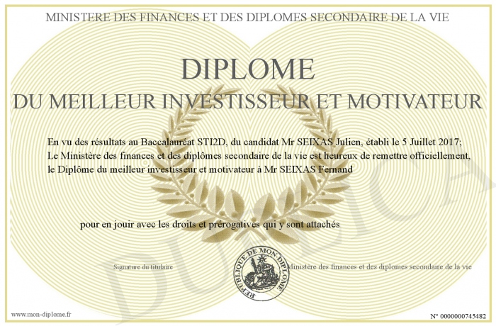 Envoyez par email votre Diplome du meilleur investisseur et motivateur personalisé