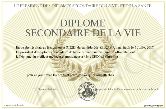 envoyé par le Le président des diplômes secondaire de la vie et de la santé !
