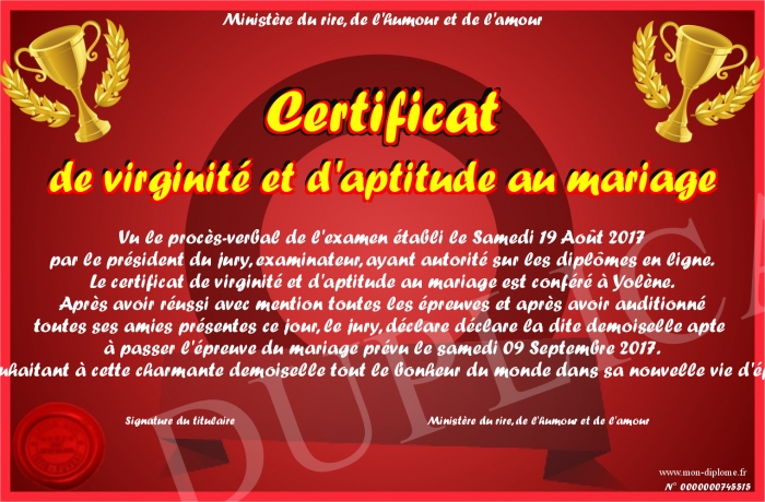 Envoyez par email votre Certificat de virginité et d'aptitude au mariage personalisé