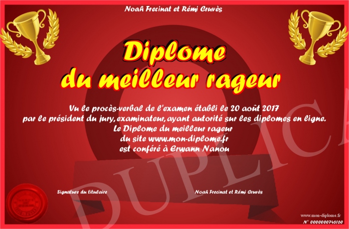 Envoyez par email votre Diplôme du meilleur rageur personalisé