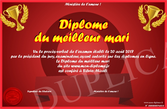 Envoyez par email votre Diplôme du meilleur mari personalisé
