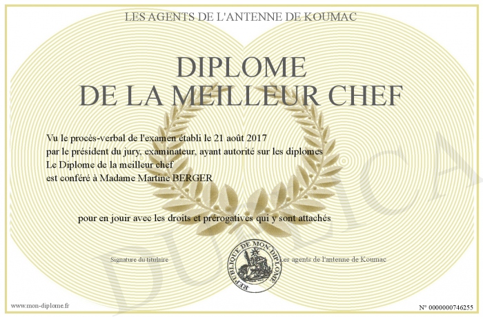 Envoyez par email votre Diplôme de la meilleur chef personalisé