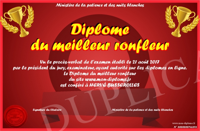 Envoyez par email votre Diplôme du meilleur ronfleur personalisé