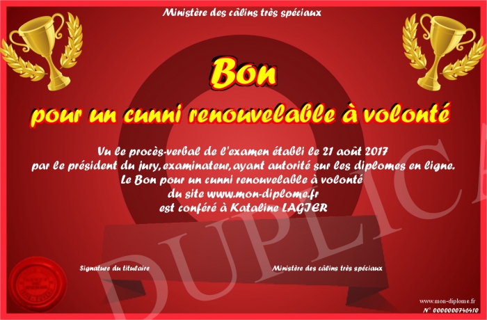 Envoyez par email votre Bon pour un cunni renouvelable à volonté personalisé